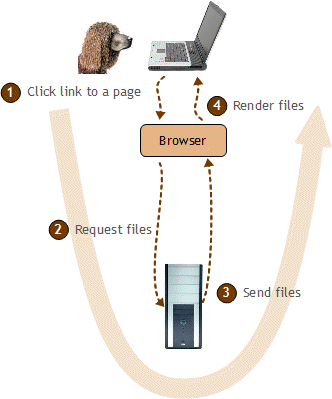 Pengguna mengklik tautan ke suatu halaman, misalnya ke kity.html. Peramban web/browser meminta berkas tersebut, menerimanya, dan menampilkan HTML yang diterimanya.